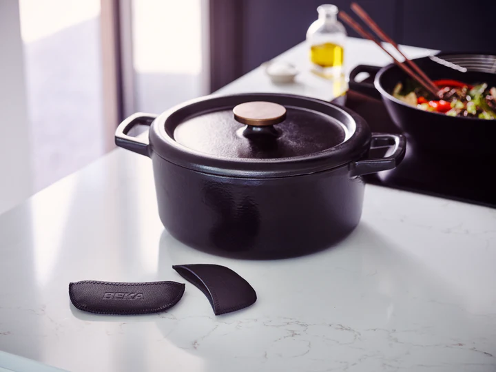 Til hete gietijzeren Nori-items (of ander kookgerei) moeiteloos op met deze set van 2 leren handvatten.]]>